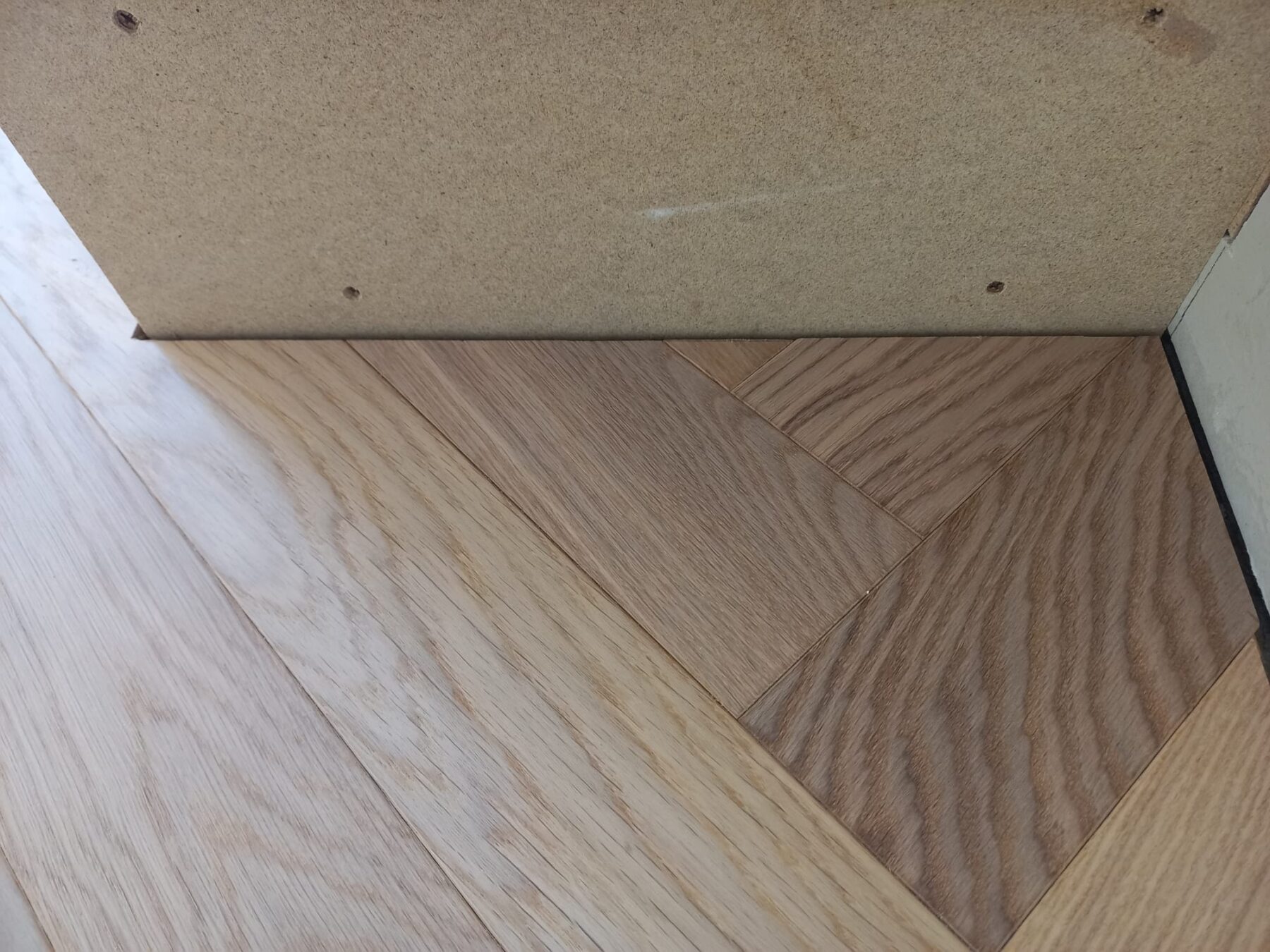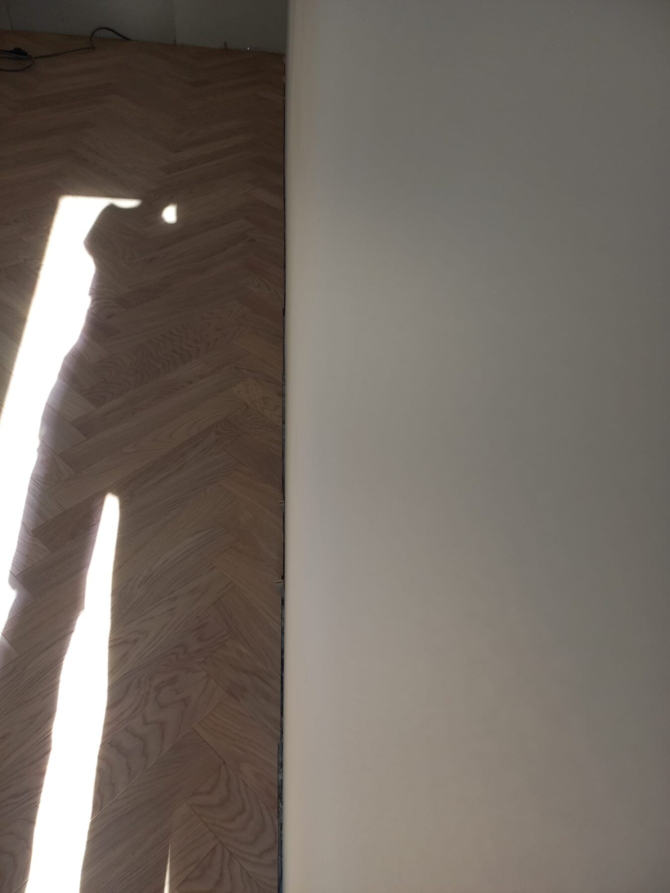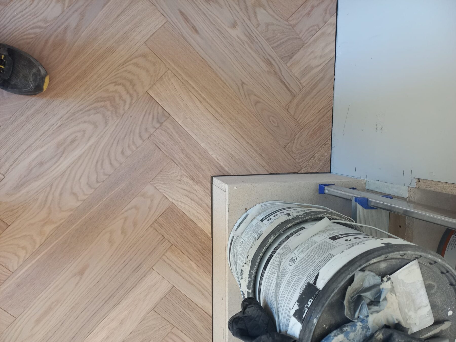 En viktig del av enhver fiskebensparkett legging er nøyaktigheten i arbeidet. Dette gjelder spesielt ved tilpasninger langs vegger, hjørner og faste installasjoner. I dette prosjektet har vi lagt stor vekt på presise kutt for å sikre et perfekt sluttresultat.