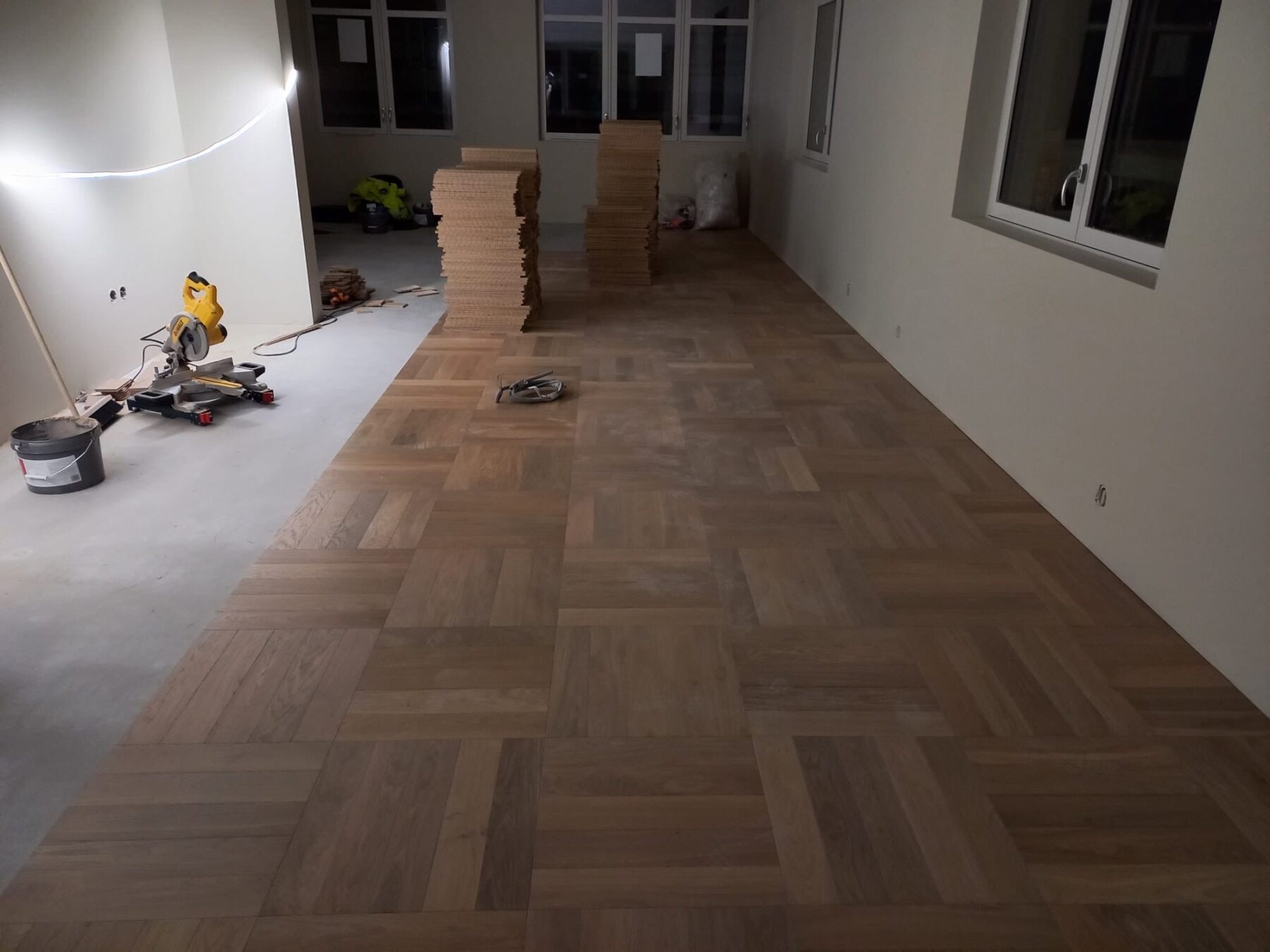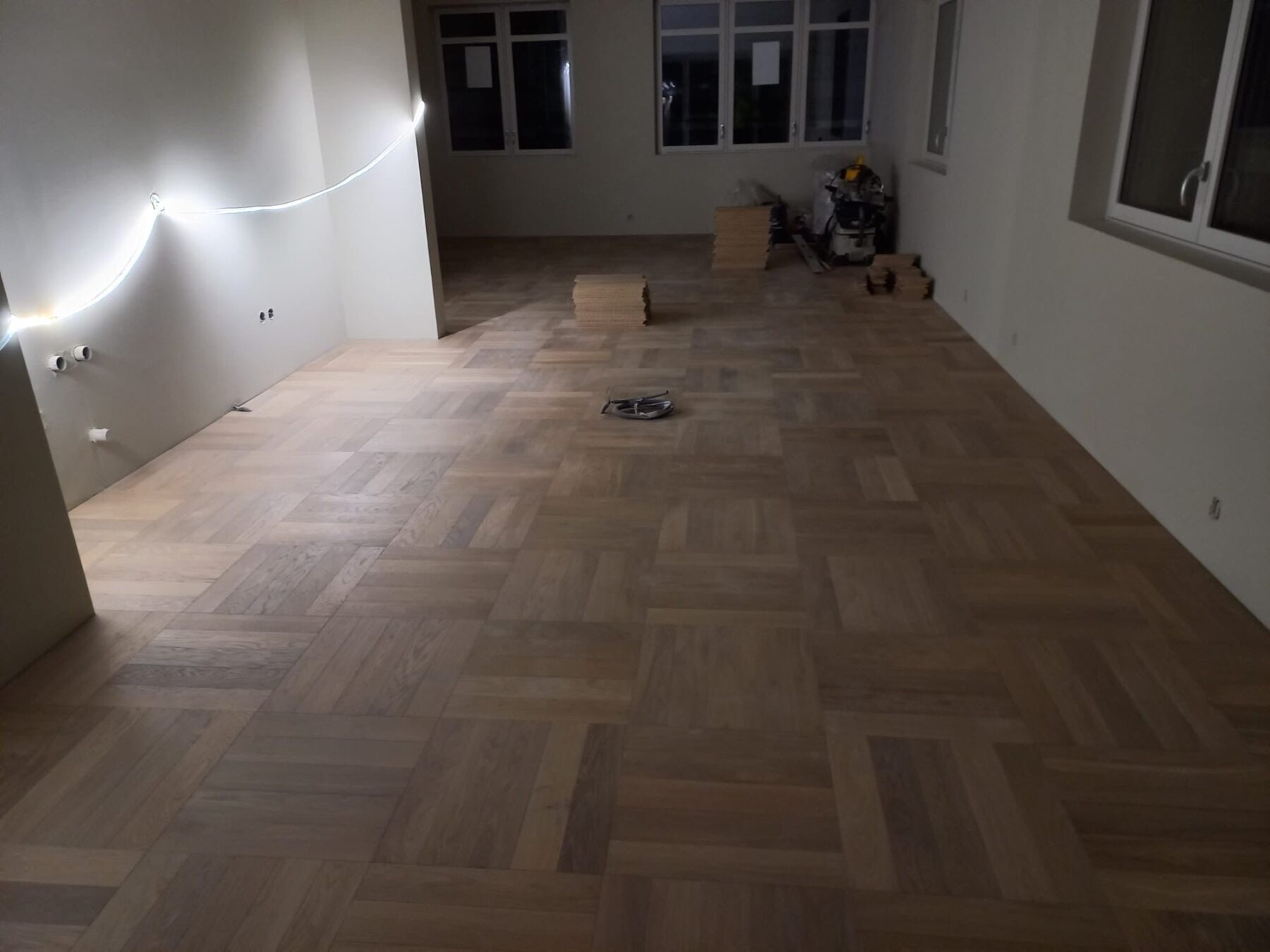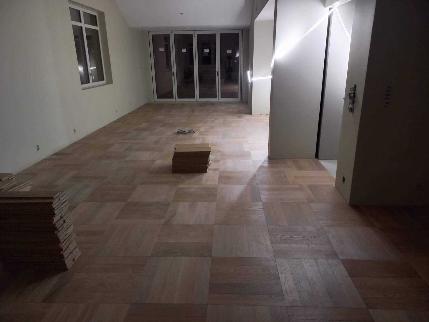 Med en så flott beliggenhet fortjener også interiøret et gulv som gir rommet karakter og eleganse. Derfor ble det valgt parkett i Firkantmønster, et mønster som kombinerer klassisk design med moderne arkitektur.