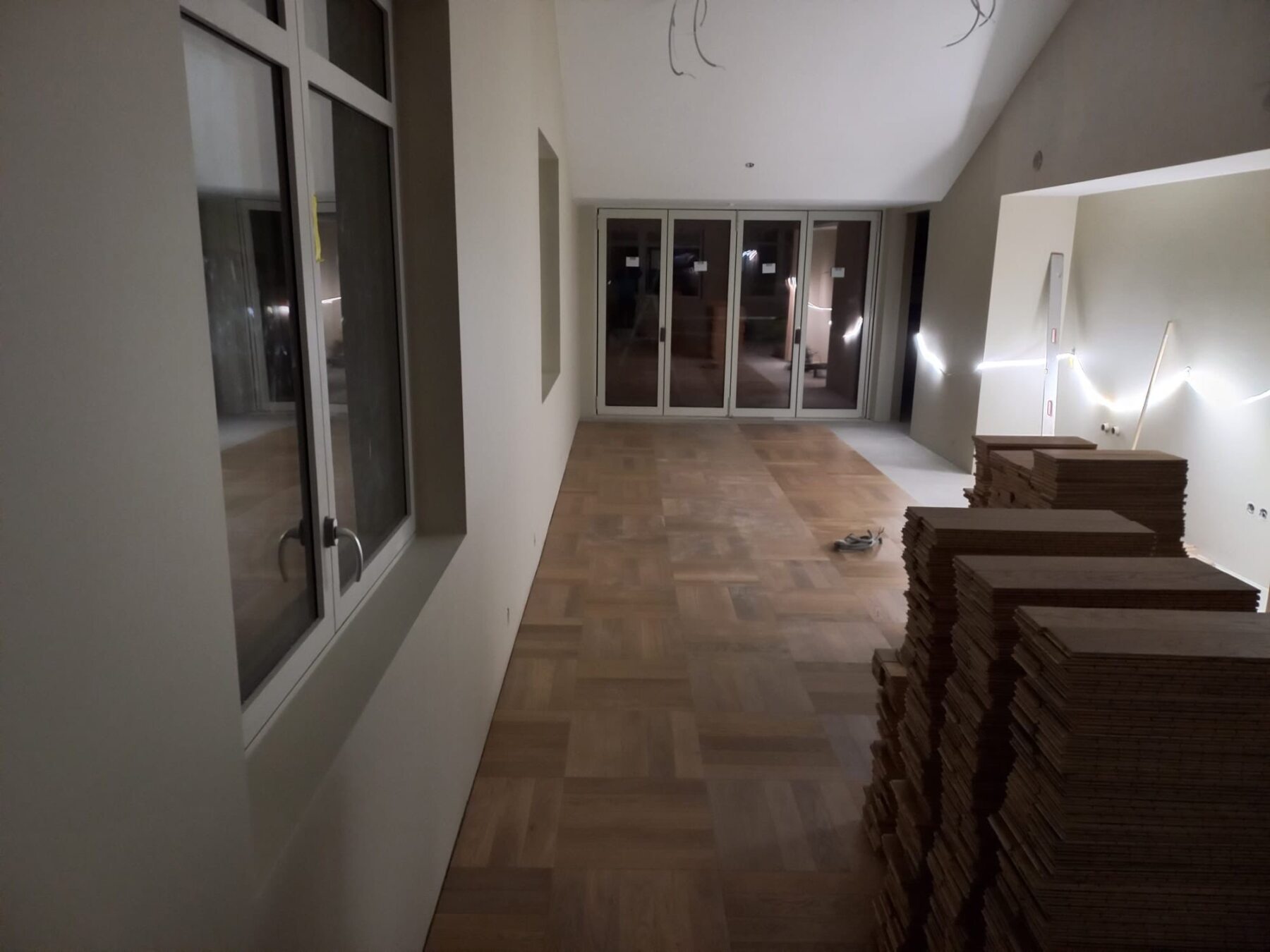 Når parketten legges på store sammenhengende flater, får mønsteret en rytme som gir rommet både dybde og karakter.