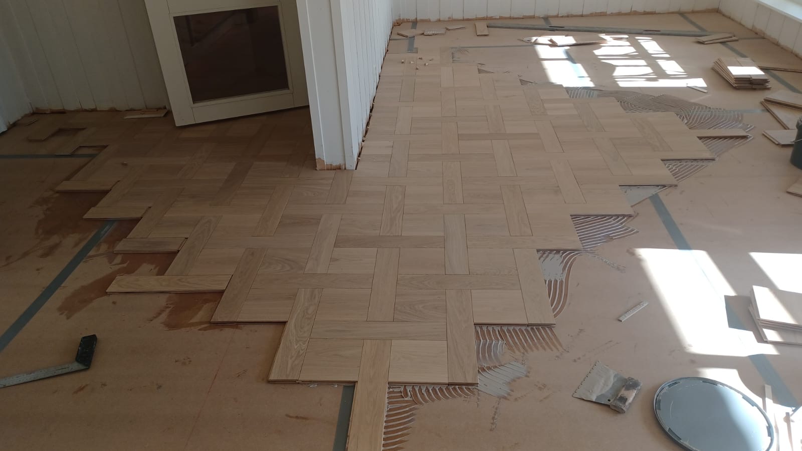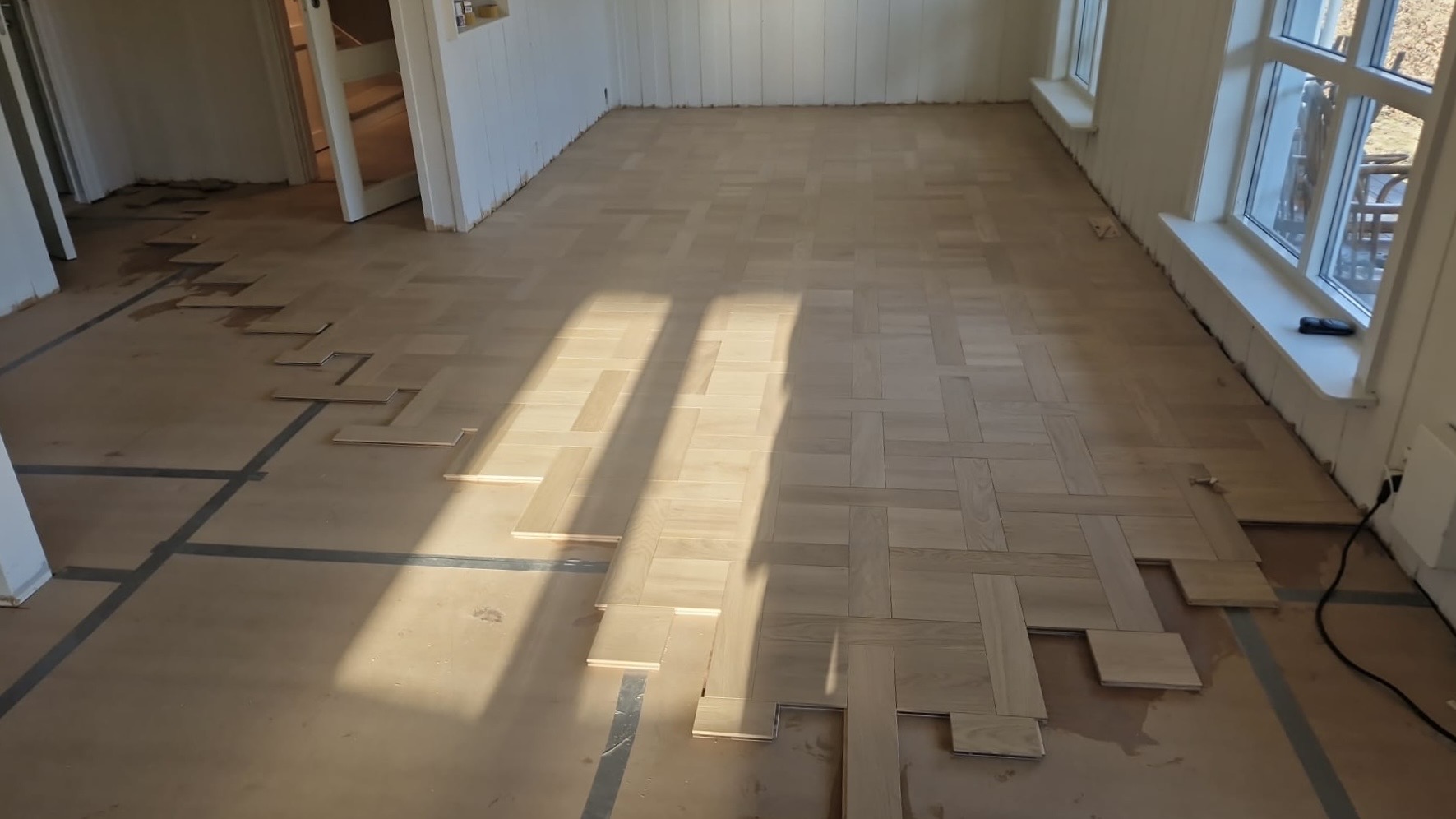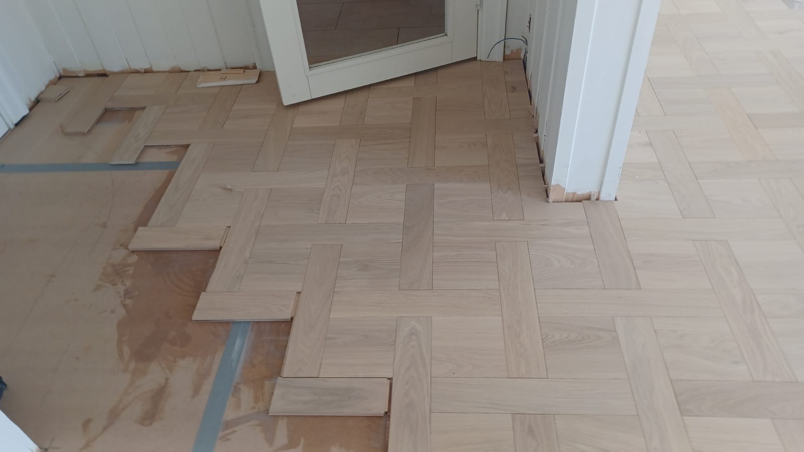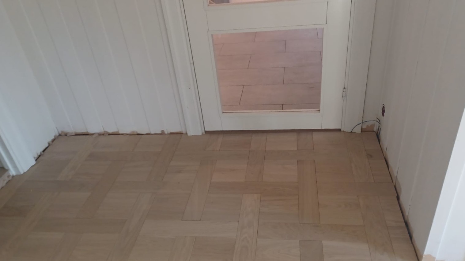 I dette prosjektet i Asker jobbet vi med et areal på totalt 65 kvm. Gulvet ble lagt med hellimt metode, noe som gir økt stabilitet, bedre akustikk og en solid følelse under føttene. Helliming er spesielt anbefalt for komplekse mønstre som Versal mønster, da det sikrer at hver enkelt del ligger perfekt på plass over tid.