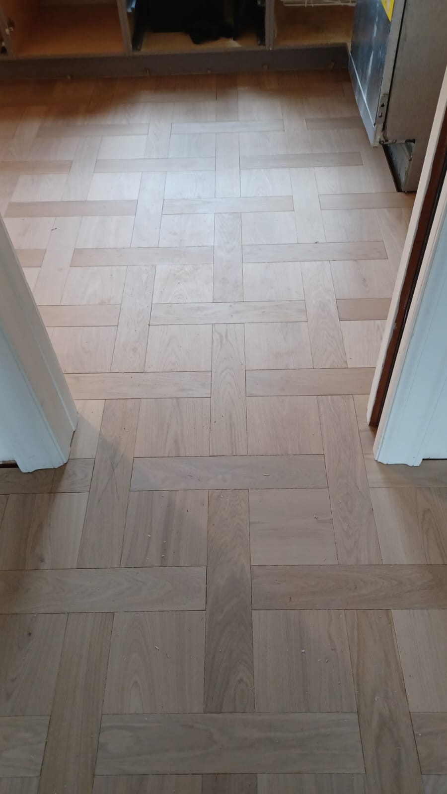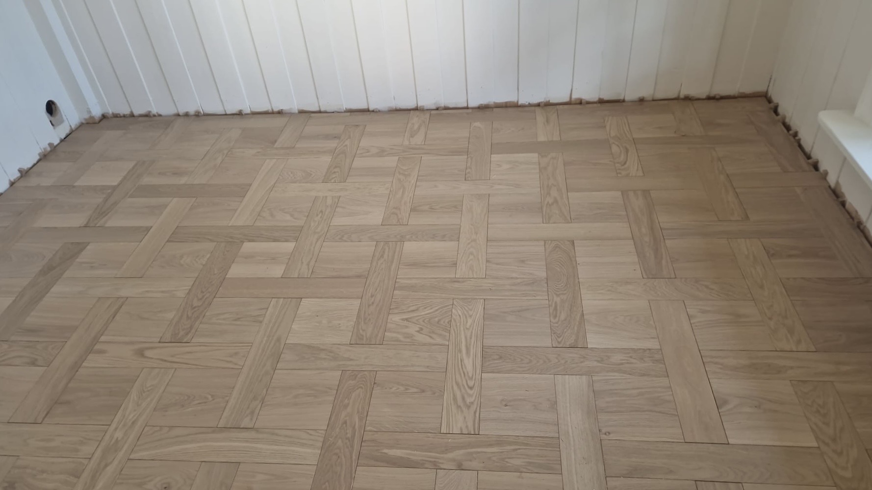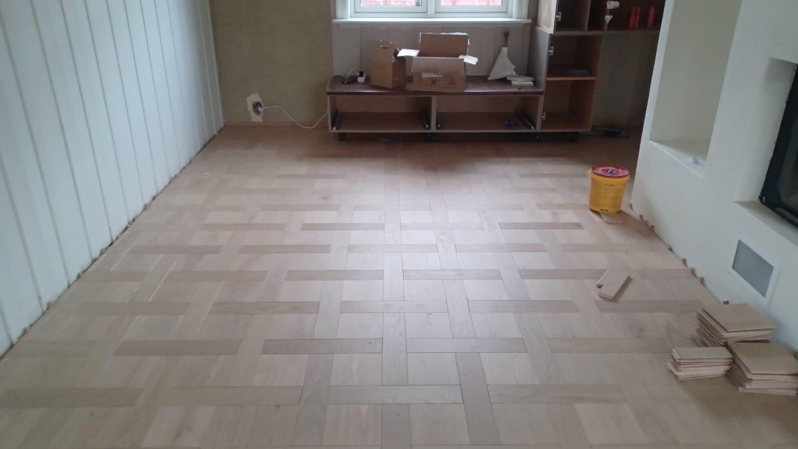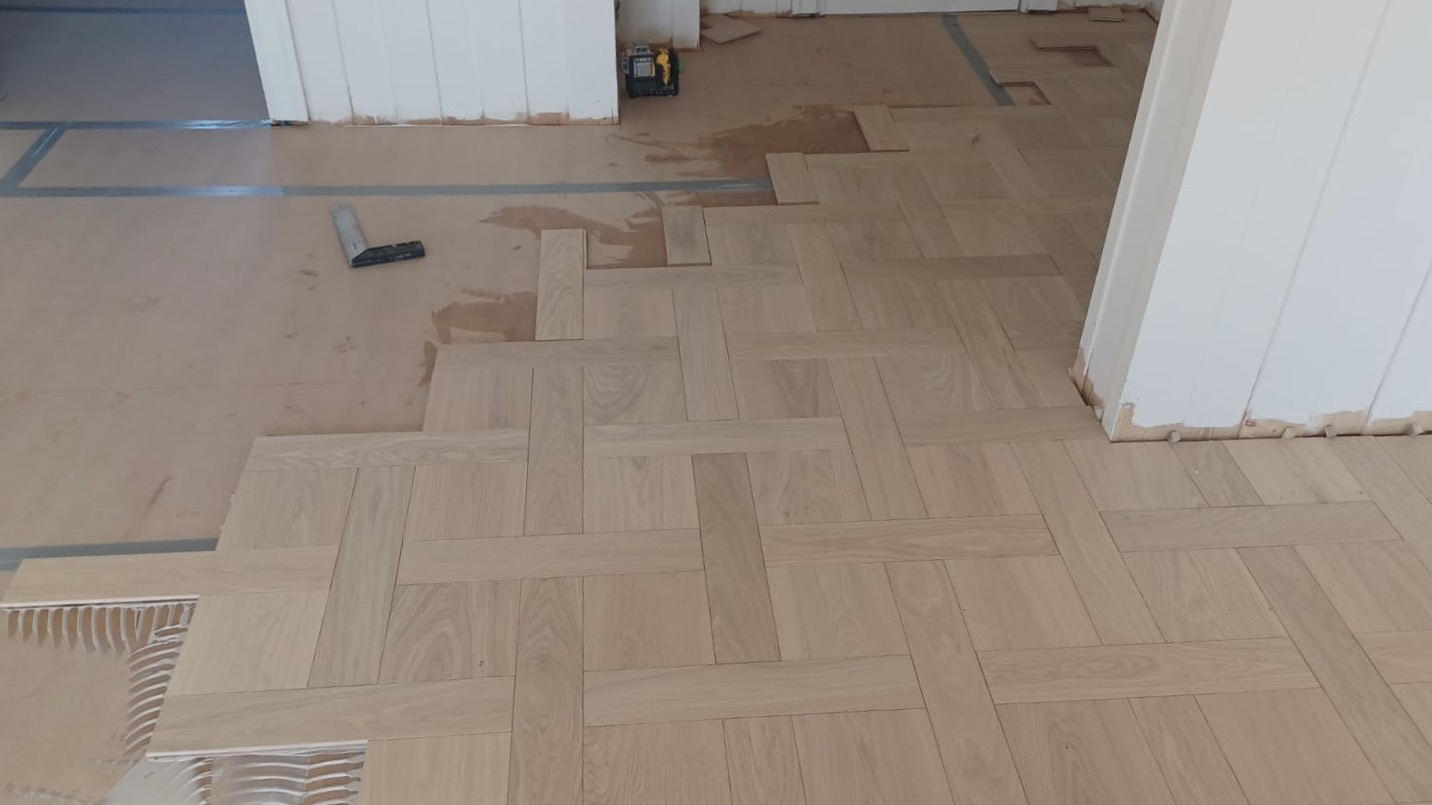 I dette prosjektet i Asker jobbet vi med et areal på totalt 65 kvm. Gulvet ble lagt med hellimt metode, noe som gir økt stabilitet, bedre akustikk og en solid følelse under føttene. Helliming er spesielt anbefalt for komplekse mønstre som Versal mønster, da det sikrer at hver enkelt del ligger perfekt på plass over tid.